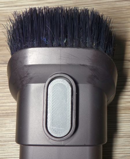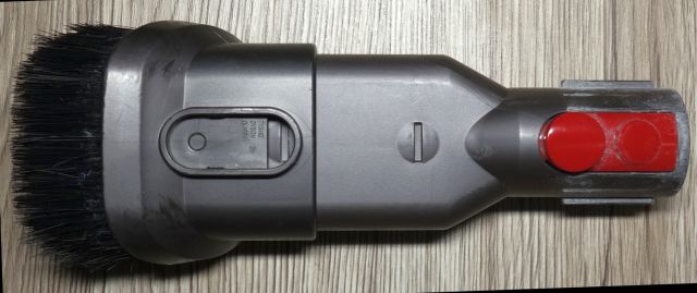 その後、調子よく動いていたのですが、取り換え式のブラシを掃除機の先端に取り付けて、ゴシゴシと力を込めて掃除をしていたら、ブラシのボタンが壊れました。