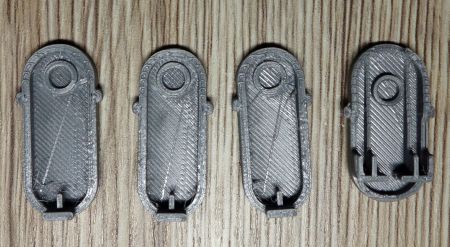 3つほど微妙なサイズの調整のために試作品(失敗作)が出来ました。(一番右は Thingiverse で公開されていたダイソンの他のパーツ用のボタンです。)