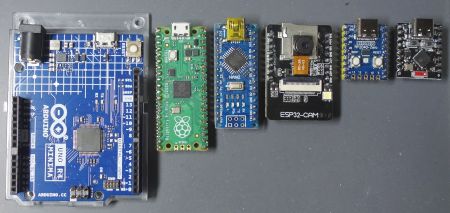 (左から Arduino UNO R4、Raspberry Pi Pico、Arduino Nano、ESP32-CAM、RP2040、ESP32C3 です。)