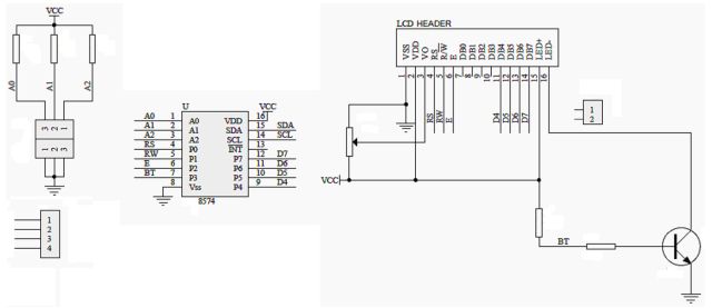 これを見ると「PCF8574」の Pin 7(P3)信号名は「BT」だけが、直接端子につながらずに抵抗とトランジスタを通して LED につながっています。つまり、このままではこの端子(P3)だけは使えないですね。