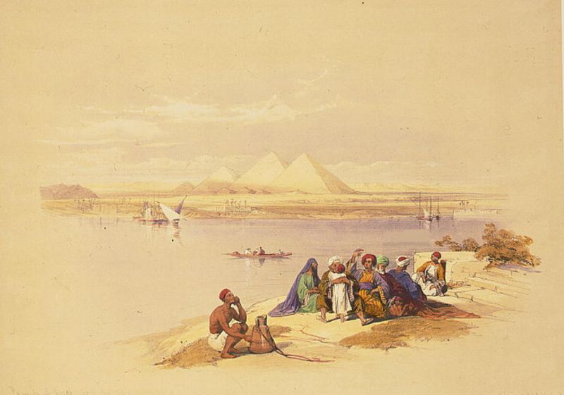 この絵は、ダムが出来る前の1840年代にDavid Roberts 氏が描いた彩色リトグラフの「Pyramids of Geezeh, from the Nile」という作品で「旅行スケッチを基にロンドンで仕上げた名作」とされています。