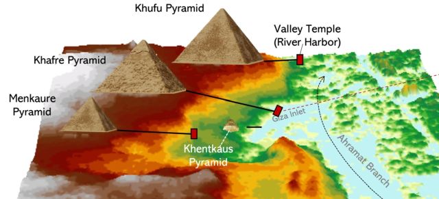 その論文の中で、衛星や地中レーダー (GPR) と電磁トモグラフィー (EMT) を使用した地球物理学的な調査結果が示されていて、現在、ピラミッドから 10 km ほど離れた場所を流れているナイル川には、当時は「アフラマート支流」(「ピラミッド支流」の意味)があったそうです。この支流は表層水深 2 ~ 8 m、水路長約 64 km、水路幅 200 ~ 700 m を有しており、これは現代の隣接するナイル川の流路幅とほぼ同等です。