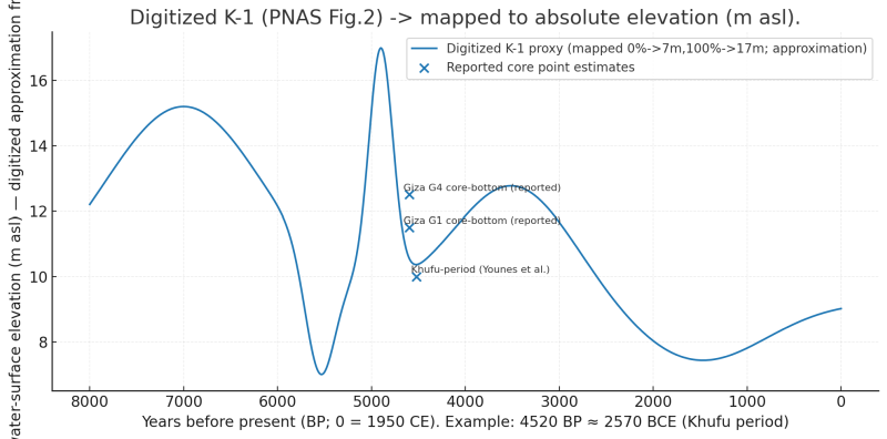 3大ピラミッドを建設した5000年から4500年ほど前(BC 2600年頃)は、ナイル川の水位が他の時期より高く、概算で 17 m 程だったという回答がありました。(下のグラフは ChatGPT が作成。青バツ印はピラミッドの建設年)