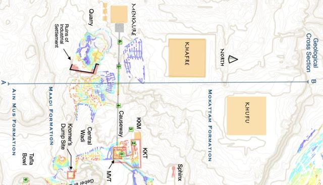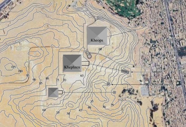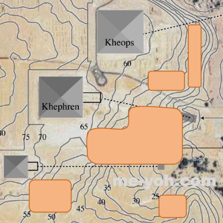 HAL{フランスの研究成果を共有するための学際的なオープンアーカイブ}の「Geological and Geomorphological study of the original hill at the base of Fourth Dynasty Egyptian monuments.」という論文の中の調査資料で、ピラミッド周辺の等高線を含んだ地図を見つけました。