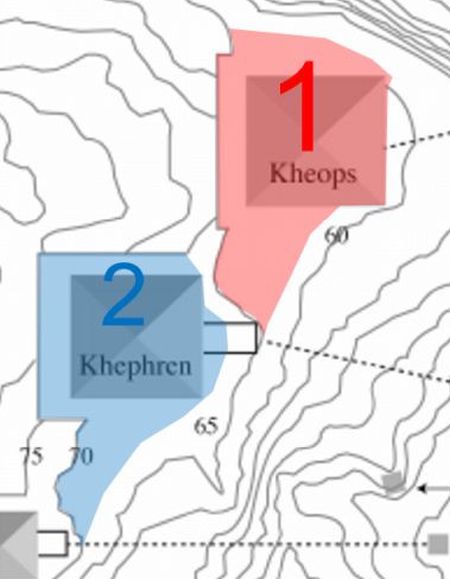 上の項目で、ピラミッドの建築場所に等高線を足した際に、ピラミッドの周辺の地形が明らかに人の手が入ったように鋭角に切り取られているのに気づきました。(下図の1と2の位置が大きく削られています。)