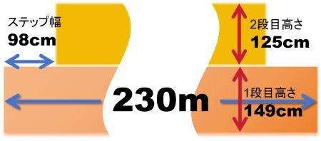 また、各段の高さだけではなく「ステップ幅」と呼ばれる格段のズレの計測値も残っているので、これらを使って1段ごとの面積を求めます。
