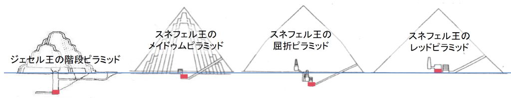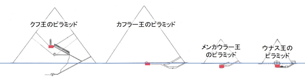 階段ピラミッド、メイドゥムピラミッド、屈折ピラミッド、レッドピラミッド、カフラーのピラミッド、メンカウラーのピラミッド、ウナスのピラミッドは地下または地上に「墓」が配置されています。