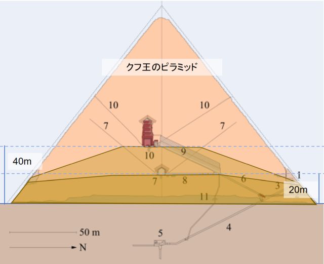 確かに色々とピラミッドの断面図を探していると、底辺が平らではなく一部盛り上がって描かれています。(上のピラミッドの断面図を見てください。)