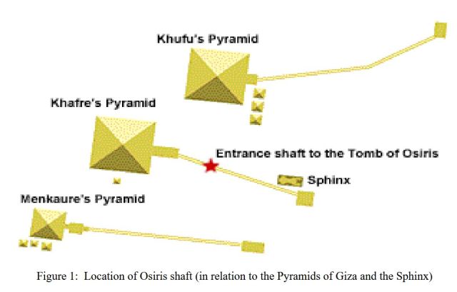 「オシリス・シャフト」は、カフラーのピラミッドの複合施設内の「参道」にあり、第3層の深さとクフのピラミッドの「地下の間」とは同じ程度の深さ(地下約 30 m)にあります。