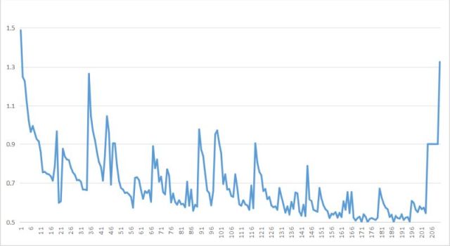 そして、石の高さと「ステップ幅」を使えば次の段の幅が計算できるので、最上段まで(210段分)表計算ソフトで繰り返して計算してみます。