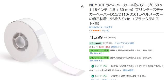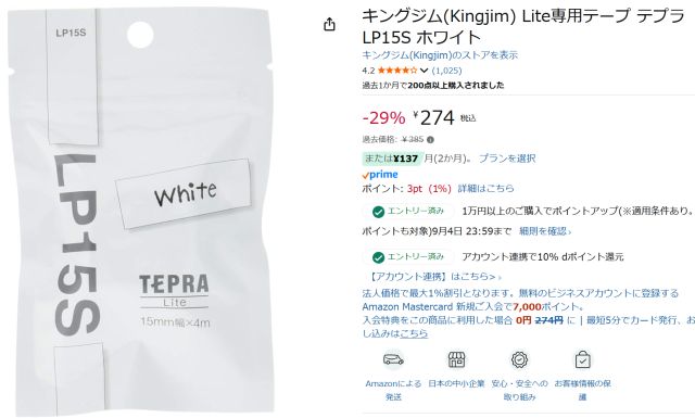 1本のテープを買っておけば200枚弱のラベルを印刷できるので、直ぐに無くなる事はありませんが、追加で購入することを考えて Amazon で純正テープが売っているか調べてみました。